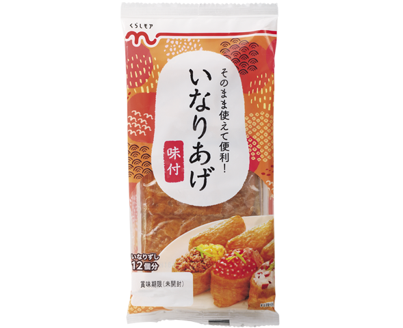 油揚げを甘辛く味付けをしたいなりあげで、酢飯を詰めるだけで簡単にいなりずしができます。酢飯の代わりにおもちを詰めて電子レンジで加熱して、「いなりもち」としてもお楽しみいただけます。1袋でいなりずし12個分ができます。